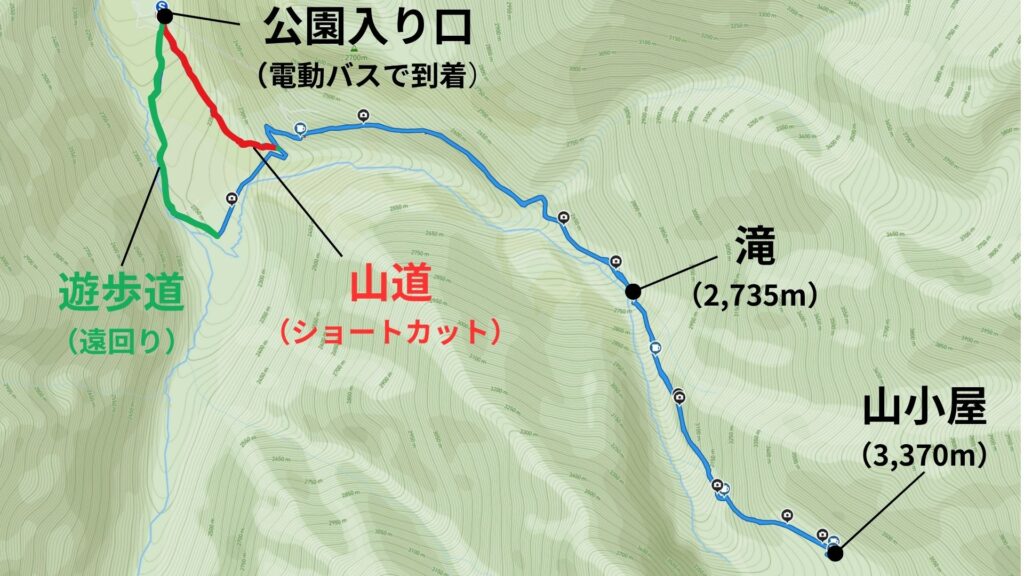 少し進むと我々の目的地である山小屋への道が見えてきた。左手に見える滝から右斜め上に続く道ー…ん?