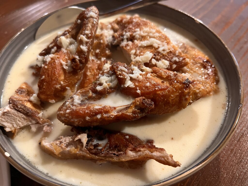これは日本でもとても有名なジョージア料理ですね。シュクメルリ村が発祥というこの料理は、鶏料理というよりはニンニク料理という方が正しい気がする。これでもかというニンニクの量で、次の日の夕方までキッス禁止になりますので気をつけてください。ただそれでも食べたい美味しさ。
