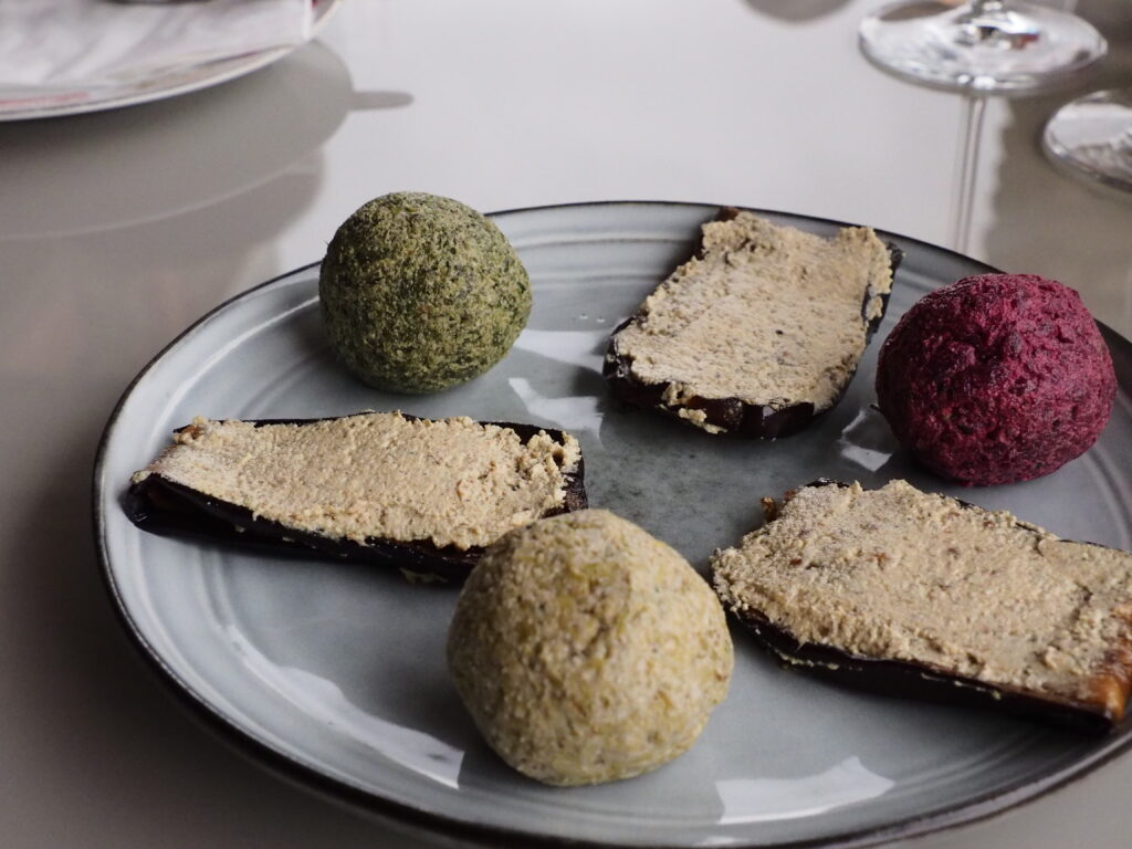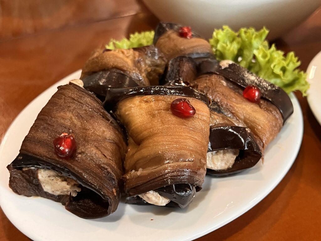 ジョージアの定番前菜。ちょっと焼いた薄切りのナスで、ニンニクやスパイスを練り込んだくるみペーストを巻いた冷製の料理。スパイスといっても辛いものではなくて、コリアンダーとか香りづけ系が使われる。コクのあるくるみペーストが、焼いて甘みの出たナスによく合って、美味。