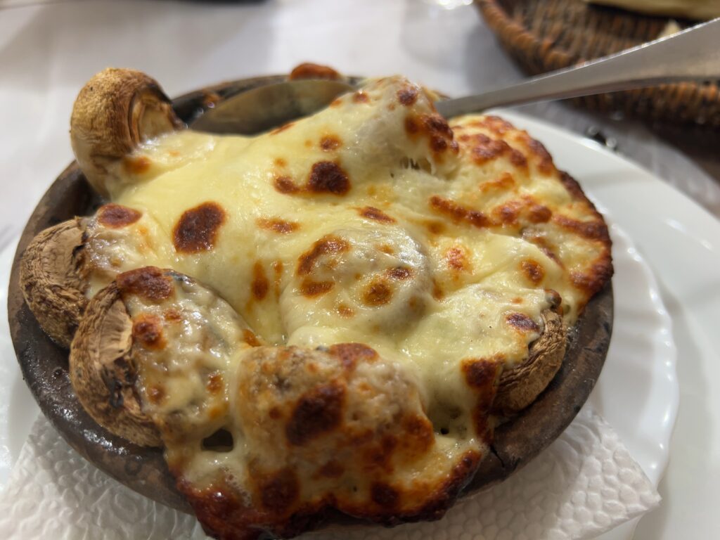 マッシュルームに、もってりのび〜るスルグニチーズを乗せてオーブンで焼きあげる料理。ケツェと呼ばれるジョージアの土鍋というか素焼きの器でグリル、そしてサーブされます。スルグニチーズは弾力があってお腹に溜まるので意外とお腹いっぱいになる。