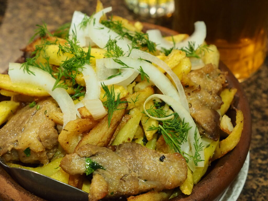ニンニク肉じゃがみたいな、存在感がぶつかり合う大きなフライドポテトとマリネされた大きな肉の豪快な料理。ニンニクスメルと塩味、イモと肉のそれぞれの甘みが溢れるジョージア定番のおかず。見た目まんまの味でではあるが、豚肉の甘みとジューシーさには驚かされることが多い。その旨味を吸ったイモも最高。