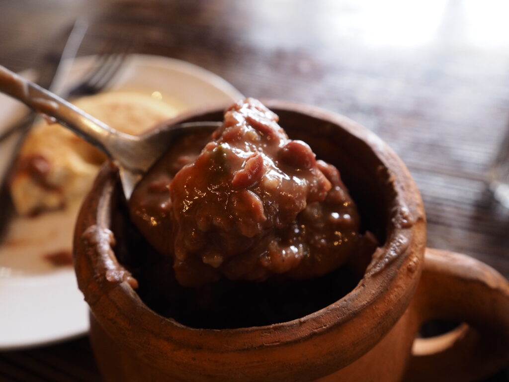 素焼きのポットで作る赤いんげん豆の料理。ニンニクやくるみペースト、玉ねぎ、コリアンダーなどのスパイスと煮込まれる。地方によってはワインを足したり、冷製でヨーグルトを添えたりと、いろいろなアレンジがあるみたいです。