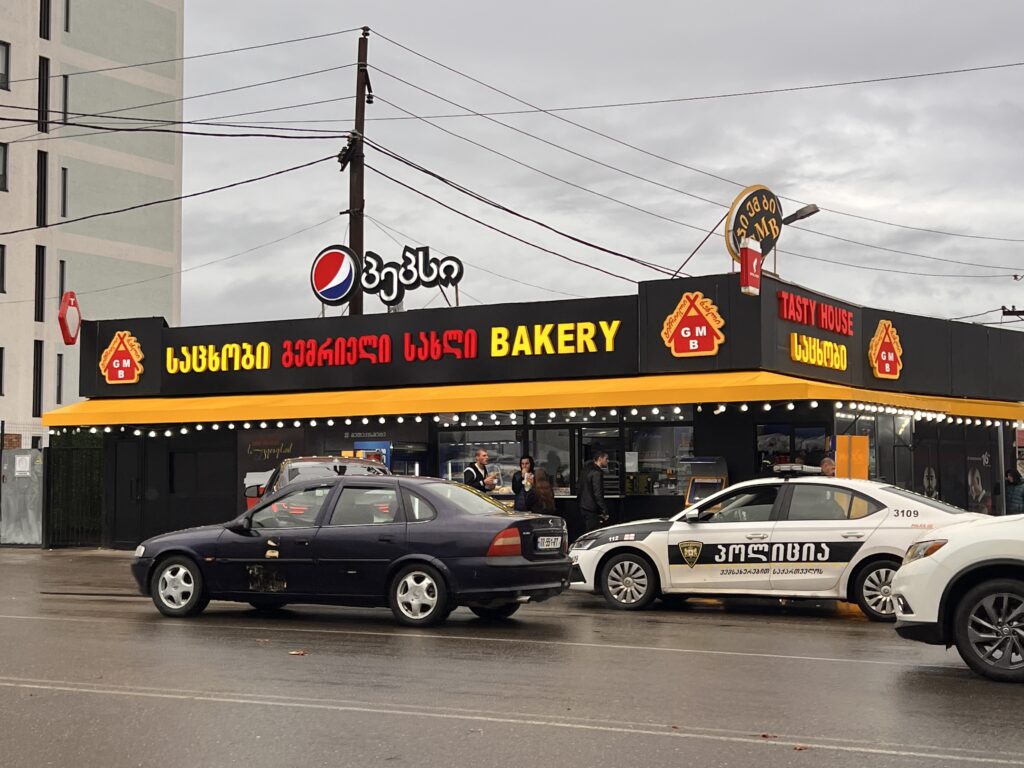 クタイシは車をピッととめてサッと惣菜パンやコーヒーが買えるファストフード店が乱立しており、主におじさんに人気があります。シャウルマ(ケバブラップみたいなやつ)屋さんも多いし、パン屋さんもいろんな惣菜パンを置いてたりするので、手軽なファストフード利用する人多い印象ありますね。トビリシとか他のまちがどうだったかはもう覚えてないんですけどね。(記憶力)