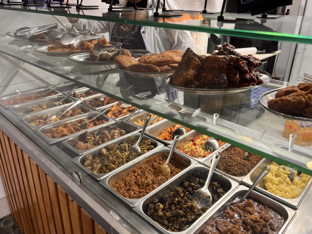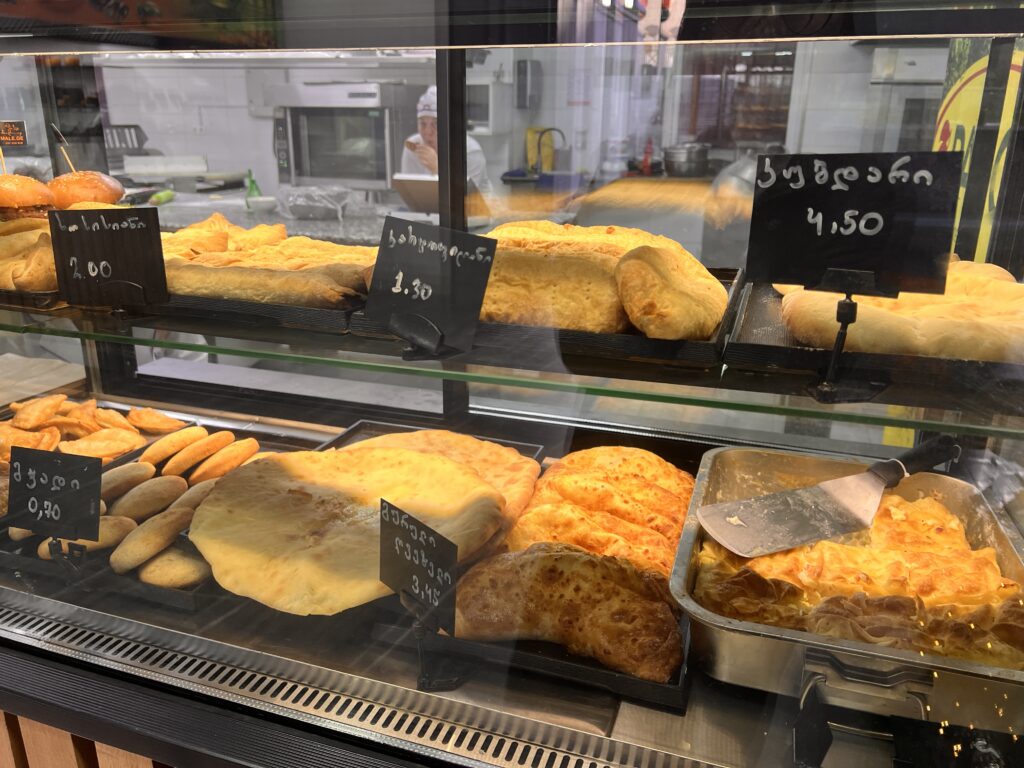 これまた町外れのローカル食堂。メニューはなくて、ショーケースに雑多に詰め込んだお料理をかっぷくのいいママがジョージア語であれこれ教えてくれます。プハリとかすごい味見させてくれて、ニンニクが効いてて美味しかった。完全に酒のつまみ。厨房に炭火の焼き台があって、焼き物もいいわよ!とおすすめされたけど、1ポーションがデカかったので断念。美味しそうだった…!笑