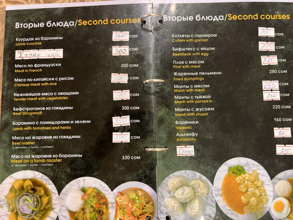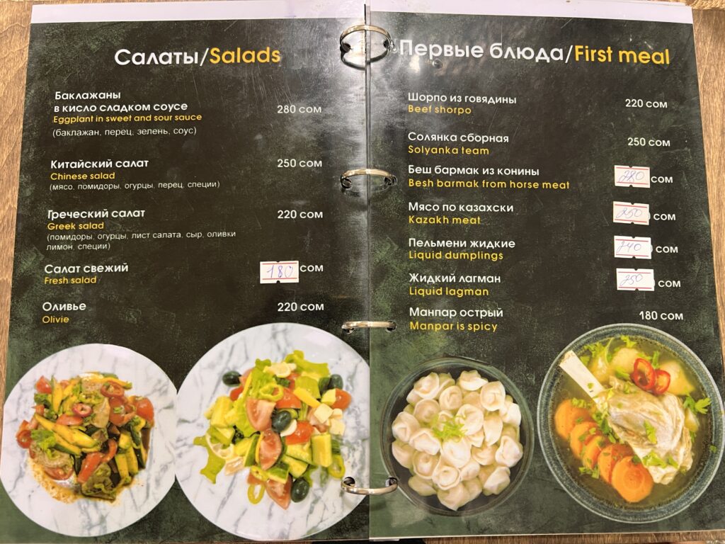 グルラグマン250ソム(約¥440)、クルダック400ソム(約¥700)+サ10%=715ソム(約¥1,230)ナリ。